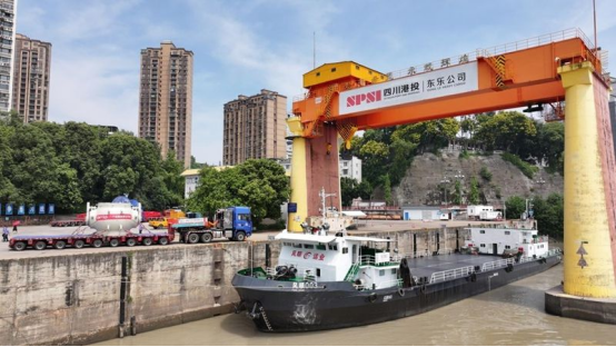 乐山大件码头作为四川大件运输水陆转换枢纽,地处三江汇流下游,航道水深稳定、江面宽阔,具备千吨级通航条件。自1995年为服务三峡枢纽工程兴建以来,已成为长江经济带重要物流节点。利用码头配备的550吨桥式起重机,球阀与中压模块将在这里完成吊装转运的全过程。“采用桥式起重机,是因为码头固定轨道作业稳定,能最大程度保障设备安全。”尊龙时凯人生就搏大件物流技术部技术经理罗崎瑞介绍说,“单件设备上船后需要花1小时进行加固作业,确保航行中万无一失。”